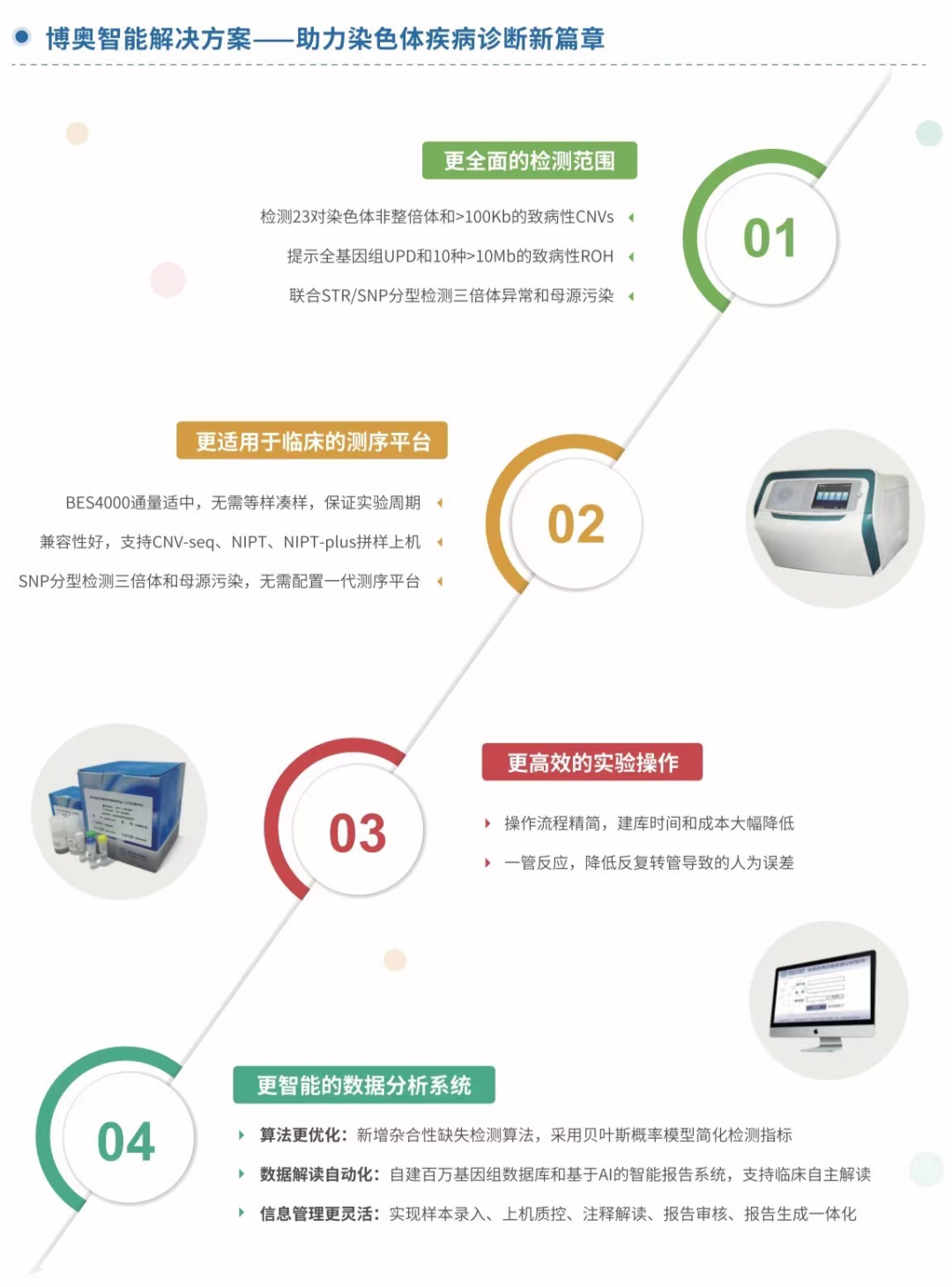 为助力临床精准诊断,博奥门徒平台在常规CNV-seq检测23对染色体非整倍体和>100Kb染色体拷贝数变异的基础上进行优化升级,同步推出检测试剂盒(RUO)和LDT检测服务。CNV-seq plus不仅能实现特定UPD检测、三倍体检测和母源污染鉴定,还能为临床提供本土化样本检测、数据解读和报告生成的一体化解决方案,进一步助力临床提高诊疗效率。